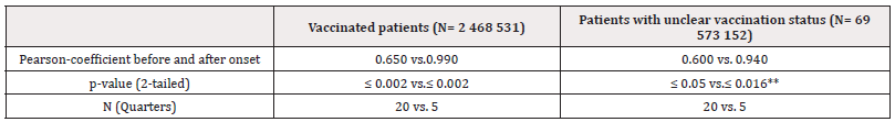 Table 2: Correlations between time after onset of vaccination campaign measured in quarters and number of eye-related treatments in vaccinated patients and patients of unclear vaccination status, correlations calculated within 20 quarters before and five after onset of vaccination.