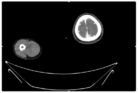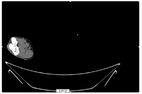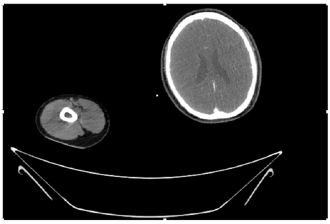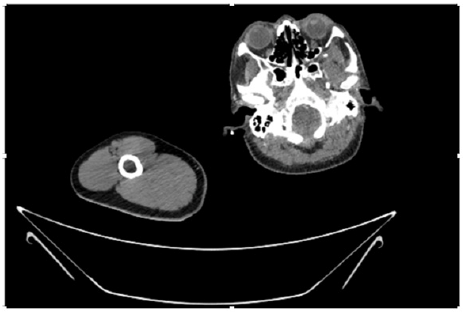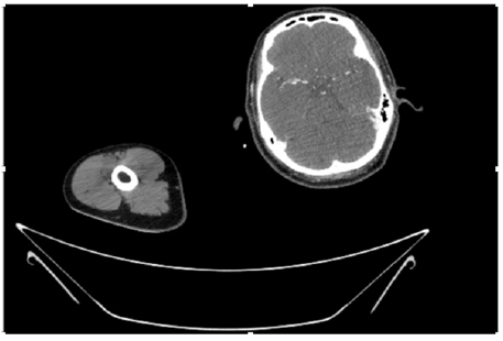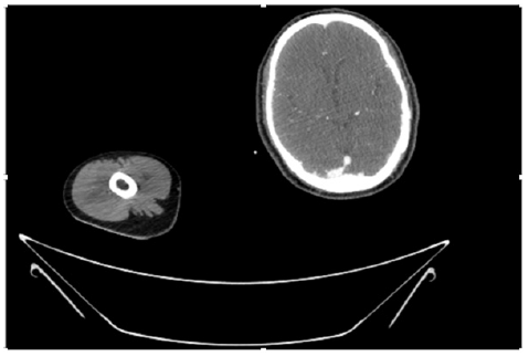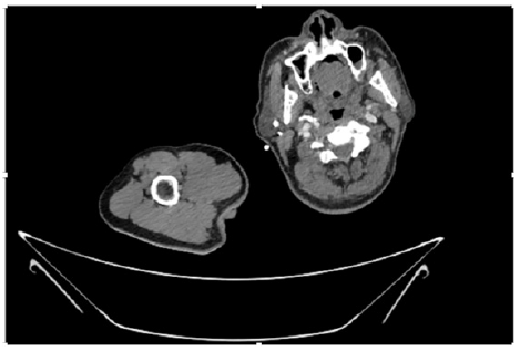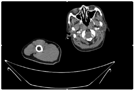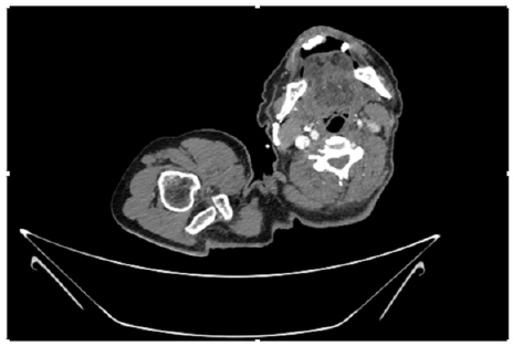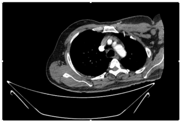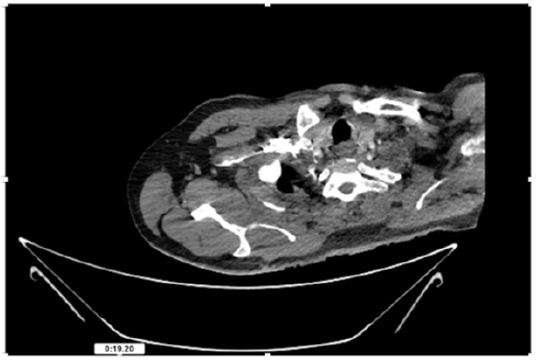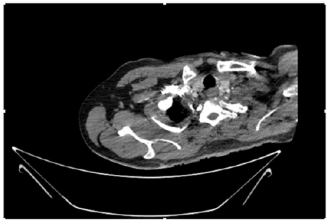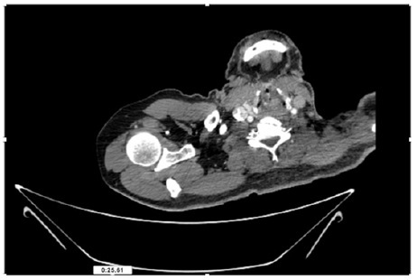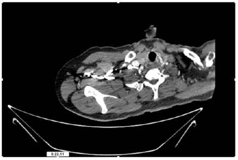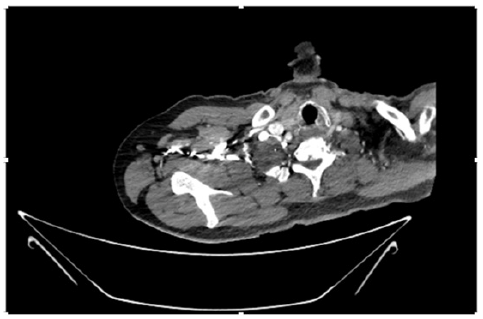 Figure 10: CT Angiogram at upper arm showing totally occluded right axillary artery; normal internal carotid artery and external carotid artery.