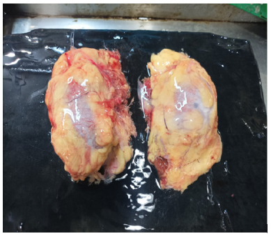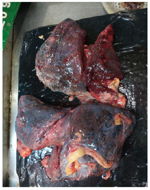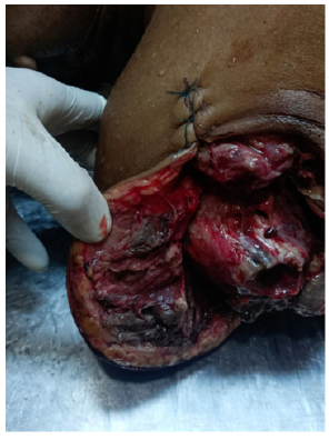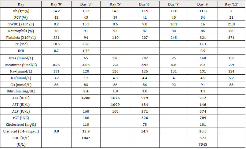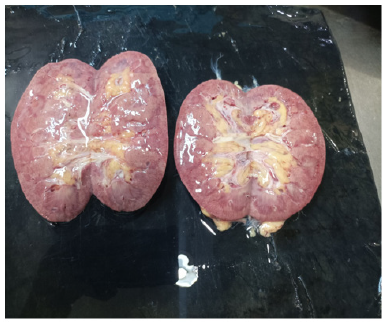 Then, the condition deteriorated rapidly; temperature 100˚F; the patient became oliguric; and, serum creatinine rose. Nephrologist opinion was Stage III AKI with sepsis and DIC; the renal team arranged for hemodialysis. Moreover, the patient had acute liver injury; he became jaundiced; serum bilirubin rose; and, ALT was more than 100 times normal (4289IU/L). Evidence of sepsis, DIC and acute kidney injury became more evident; neutrophil leukocytosis (total WBC 15x109/L); platelets dropped to 94x109/L; and, serum creatinine was 3.2mg%. Furthermore, the amputated wound was unhealthy; the color changed to brownish; it was having foul smelling discharge without active bleeding. Transthoracic echocardiogram showed dilated left atrium and left ventricle; LVEF was 48%; mild mitral regurgitation; and, no clot. Blood culture revealed Staphyloccus Capitis; sensitive to Gentamycin, oxacillin, ciprofloxacin, ceftriaxone, meropenum. Therefore, on Day ‘6’ bone shortening of amputated stump was done by orthopedic surgeon; escalation of antibiotics was done. The overall condition was poor. On Day ‘12’, during 4th time hemodialysis, the patient had severe chest pain, dyspnea and sweeting; BP was 170/149mmHg; pulse rate was 120/minutes; SpO2 was not measurable; sudden cardiac arrest. There was no response to active resuscitation. As it happened suddenly within 5 minutes, ECG recording was not done. The clinical impression was either acute coronary syndrome or pulmonary embolism. In autopsy, coronary ostia were normal; no occlusion. It is shown in Figures 15-17 reveal acute kidney injury, normal size kidneys with normal cortex and medulla. Figure 18 demonstrates occlusion of superior mesenteric artery with thrombus; Figure 19 illustrates dis-colored caecum as a result of ischemia. Figure 20 reveals slightly enlarged liver with congestion compatible with acute liver injury. Figure 21 shows tar staining of both lungs. Figure 22 is the amputated stamp on right mid-arm; the color of muscle is brownish. There was no evidence of pulmonary embolism (Figures 23-28) (Table 1).