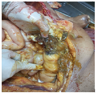 Figure 24: Autopsy of lower abdomen showing discoloration of caecum, sequelae of occlusion of superior mesenteric artery.