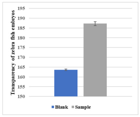 The test established three groups including a blank control group (fish embryo culture medium/solvent solution), a positive control group (caffeine solution), and a test substance group with 20 fish embryos in each group. For positive control and testing substance groups, 8mL of 0.05g/L caffeine solution and 8mL of testing material solution were added respectively. All groups were placed in a constant temperature at 28±1℃ for 2±0.5h. The fish embryos were then anesthetized with tricaine for 2 minutes, and the aortic blood vessels in the tail were pictured for 20 s under a microscope. Danio Scope was used to measure the relative velocity of blood flow in the tail aorta of each fish embryo (Figure 1). Statistical software was used to perform a two-tailed t-test on the blood flow velocity between the test material group and the blank control group (or solvent control group). The p-values that were less than 0.05 indicated significant difference (Figure 1).