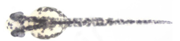 The test set up a blank/solvent control group (fish embryo culture medium/solvent solution), a 100% melanin inhibition model group (phenylthiourea working solution), a positive control group (kojic acid solution), and a test substance group (test substance). All the zebrafish embryos were incubated in a constant temperature incubator at 28 ± 1℃ for 48± 1 hours after fertilization. At least 12 fish embryos were randomly selected from each group and were carefully peel off the embryo shells with tweezers under a microscope, without damaging the fish body, and placed under a stereomicroscope for photography using uniform camera parameters (Figure 2). The software such as Image J was used for the results as the melanin content index, including steps of marking the head and yolk back area of each fish embryo, then selecting “Measure Average Intensity” in the “Measurement” column, and choosing “Average Signal Intensity”. The statistical results were calculated and represented as mean ± standard error. A two tailed t-test on the intensity of melanin signals between the test substance group and the blank control group (or solvent control group) was conducted to obtain p-values, which indicated a significant difference for a value of less than 0.05 (Figure 2).