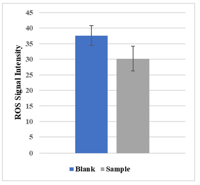 After 24 hours of exposure 24 embryos of 48hour zebrafish to a sample solution of 3.57g/L ginseng drink, the fish embryos were stained to show the ROS signal intensity through the fluorescence photography. The sample showed a 20% (p=0.0000036) clearance rate of ROS in zebrafish embryos at a test concentration of 3.57g/L (Figure 6, Figure 7A and 7B).