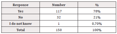 115 (76.7%), had heard of epilepsy and 35 (23.3%) did not. 117 (78.0%) answered that is epilepsy a mental illness, 32 (21.3%) said it is not and 1 (0.7%) did not know (Table2). 94 (62.7%) answered that epilepsy is hereditary and 56 (37.3%) reported it is not. 80% of respondents reported that epilepsy is not contagious.