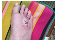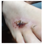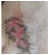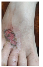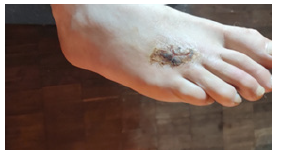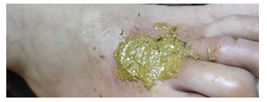Presentation of the case The use of SR-19 ointment together with bandages with wax and gauze in the treatment of burns turned out to be successful. An example can be the treatment of a victim (41 years old) from a boil. After receiving a burn in the area of the ankle joint, the victim was taken 1 hour later to an inpatient medical facility, where he was provided with emergency medical care to relieve the acute condition (clinical diagnosis: thermal infected burn of the right foot (S-1% of the body) with partial necrosis of the burn epidermis III degree,). In the future, the patient underwent systemic drug therapy to reduce pain, intoxication of the body, treatment and prevention of complications. The wound was infected, the patient underwent a full course of antibiotic therapy. On the 14th day, there was a high temperature, significant swelling, constant severe pain, heavy intermittent sleep, depression. Wounded the process was in the inflammation phase (Figures 1,2).