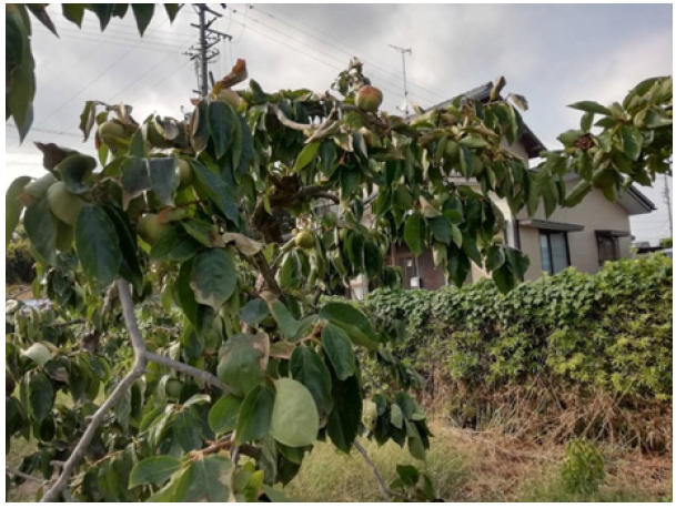 Figure 2: Wilting observed in Japanese persimmon leaves caused by high temperature, in Hamamatsu city, Shizuoka Prefecture.