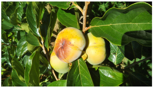 Figure 3: Sunburn observed in Japanese persimmon fruit caused by high temperature, in Hamamatsu city, Shizuoka Prefecture.