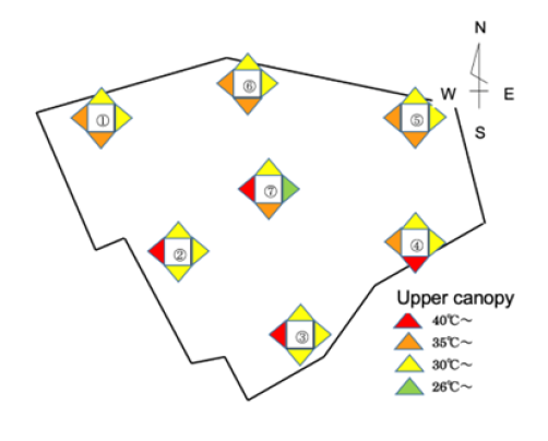 We had checked the canopy temperatures of apple orchard in Chikuma city using ultrared thermometer, at 2 o’clock afternoon on a certain September day. The picture shows the 7 checking points in the orchard where temperatures of 4 directions (north, south, west, east) were measured. The results indicate the higher temperature at west and south directions; some shows higher than 40℃ (Figure 5).