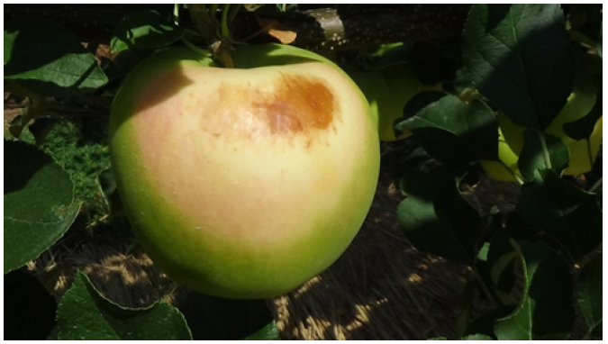 Sunburn was often found in branches at the top of the canopy, and it required pruning later. As a countermeasure, fruit located in upper parts might be pruned to leave all the fruit in lower parts. It also gives you an easy harvest works to pick the remaining fruit without using ladders. You should remark that the leaf-fruit ratio should be around 25:1 to promise well developed fruit.