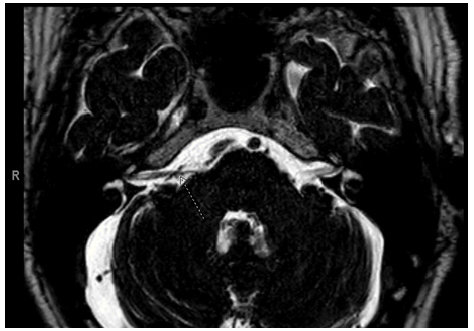 Figure 1: T2-weighted axial images of the internal auditory canal showing a right aberrant anterior inferior cerebellar artery compressing the right vestibulocochlear nerve [arrow].