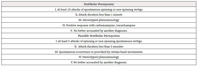 The key features of VP are brief attacks of spinning or non-spinning vertigo, binocular oscillopsia [illusory movements of the environment] and/or abrupt unsteadiness or instability of posture and gait that last less than a minute; attacks occur multiple times per day [frequencies up to 30 or more attacks per day are not uncommon], and attacks occur spontaneously, however, spells may be triggered head turning, positional changes, loud noise and hyperventilation. Attacks might or not be associated with tinnitus and hypo- or hyperacusis. Neuro-otological examination in between attack is normal, though hyperventilation while using Frenzel glasses to eliminate fixation, might trigger a nystagmus in direction to the affected ear [excitatory nystagmus] [1,3-5]. The clinical diagnostic criteria for vestibular paroxysmia defined by the Classification Committee of the Barany Society displayed in Table 1 where each point need to be present to fulfill the diagnosis or possible diagnosis of VP [5] (Table 1).