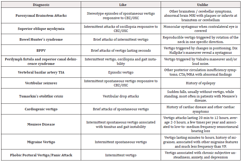 Paroxysmal brainstem attacks are caused by damage of the brainstem by multiple sclerosis plaques or vascular lesions resulting in brainstem ephaptic discharges. Patients present with intermittent attacks of vertigo responding to carbamazepine, however other features such as dysarthria, paroxysmal weakness, intermittent dysesthesias, analgesia or pain, autonomic dysregulation and ataxia could be present. Brain MRI with thin sequences across the brainstem reveals the lesions [4,5,9]. Superior oblique myokymia is another neurovascular syndrome caused by compression of the trochlear nerve. It presents with frequent paroxysmal torsion of one eye with sudden monocular vertical rotatory oscillopsia that respond to carbamazepine. Eye exam reveals a rapid nystagmoid movement when contralateral eye is covered, not seen in VP [10].