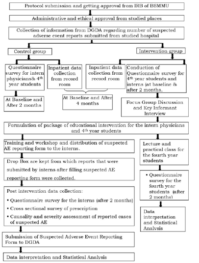 A set of educational interventions (Lecture and practical class) were formulated and delivered to the students of the intervention group and another set of educational interventions (workshop, focus group discussion, key informant interview) was formulated and delivered to the interns of the intervention group along with suspected Adverse Drug Events reporting form. Treatment sheets from each hospitalized patient at the hospitals under study were, collected, recorded, and reviewed for the detection of ADEs during the study period. The number of ADE reports submitted by the hospitals under study was obtained from the Directorate General of Drug Administration (DGDA). A standard procedure was used to assess the causality and severity of the reported cases of suspected adverse events. The intervention group received repeated follow- up visits to determine the outcome. The effect of educational intervention on interns was assessed by counting the number of ADE cases and reports and comparing them between the control and intervention groups.