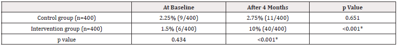 Table1. Shows after 4 months of educational intervention, the detection of cases was increased in the control [from 2.25% (9/400) to 2.75% (11/400)] and intervention [from1.5 % (6/400) to 10 % (40/400)] group hospitals. The difference was statistically significant (p<0.05) in the intervention, and also in the control and intervention groups (p<0.05). The difference was not statistically significant in control group (p>0.05) (Table1).