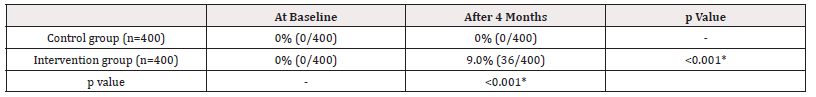 Table 2. Shows that, at baseline, none of the cases of ADE were reported to DGDA, both from control 0% (0/400) and intervention group 0% (0/400). But after 4 months of intervention, 9.0% (36/400) of ADE were reported from the intervention group and the difference was statistically significant in the intervention group and also in the control and intervention groups (p<0.05) (Table 2).