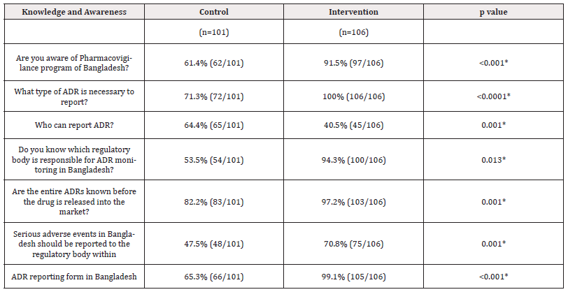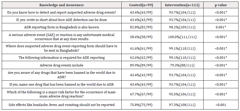 Table 5. Shows that significant differences were observed between the responses of the control and intervention groups regarding knowledge and awareness of intern physicians about ADE detection and reporting after 2 months of intervention. The response was higher in the intervention group than in the control group and the difference was observed to be statistically significant (p ≤0.05) (Table 5).
