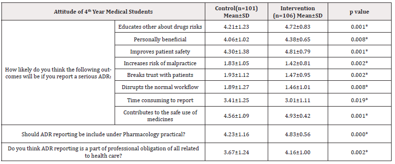 Table 4. Shows that according to the response of 4th year medical students, their attitude on ADE detection and reporting was changed after intervention in comparison to control group and the difference was statistically significant (p <0.05) (Table 4).