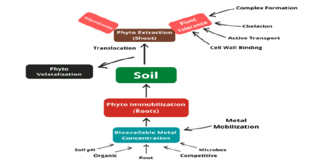 Currently the world is facing many challenges, and heavy metal pollution is one of them. Many heavy metals play essential role for plant growth as micronutrients are not toxic (e.g., Co, Cu, Fe, Mn, Mo, Ni, Al, Rb, Ti, and Zn) until they go beyond a certain limit [1,2]. There are non-essential heavy metals which are toxic to plant growth (e.g., Cd, Pb, U, Cr, Ag, Hg, and Zr), while Arsenic and Selenium are metalloids are also toxic [3,4]. Heavy metals are toxic, bio-accumulative, not naturally biodegradable, persistent and can enter the food chain [5,6]. To degrade organic contaminants from environment, chemical treatments are relatively successful, but they are quite expensive and non-ecofriendly. This technique cannot be use for removing toxic heavy metals from the soil [6]. Therefore, there is a demand for the development or use of effective, affordable, and ecofriendly technology to rectify the problem. Sustainable idea of using green plants to eradicate or reduce the metal contaminants, known as phytoremediation, has been successful as a promising environmentally sustainable technology [7]. Plants are remarkably beneficial for bioremediation to prevent leaching and erosion that can spread the toxic substances to surrounding areas (USEPA, 2004). Plants generally control the pollutants without affecting topsoil, thus conserving its utility and fertility with inputs of organic matter [8].