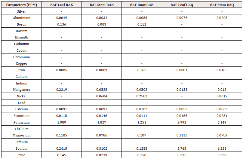Bioaccumulation Factor (BAF): The Bioaccumulation factor (BAF) from sediment to various body parts (root and leaf) of the mangrove species Avicennia marina was used as an indicator of species accumulation ability from nature and is calculated as the proportion of metal concentration in plant tissue and sediment. This study assumed that plants with BAFshoot values>1 are accumulators, while plants with BAFshoot values<1 are excluders [48]. Additionally, plants were classified as potential hyperaccumulators if the BAFshoot values were>10 [49]. The values of BAF for 23 metals from sediment to roots and leaves of the mangrove species were calculated in this study (Table 3). The results showed that all the plant parts (roots and leaves) had BAF values<1 except potassium and sodium. However, the BAF value>1 for K was found in both roots, stem and leaves of mangrove species of Ras Al Khaimah. Overall, the highest BAF value (6.228) was found for Na in the stem of Avicennia marina of UAQ. [50,45] also reported same BCF value for mangrove plants in their studies in India.