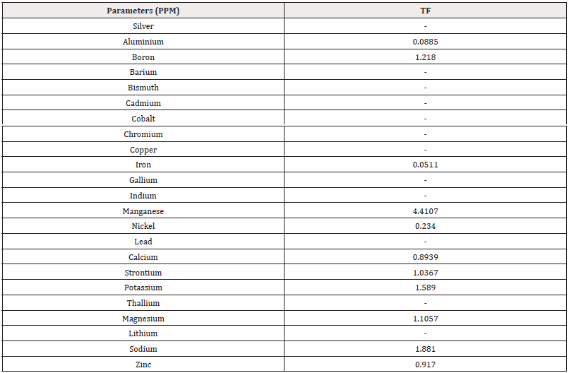 Translocation Factor (TF): The TF is the capacity of a plant to transfer metal from its roots to shoots. The Translocation Factor (TF) for each plant was calculated by dividing metal concentration in the shoot by metal concentration in the root. A TF value>1 indicates the plant’s capability to translocate metal effectively from root to shoot [37]. The equation was as follows: