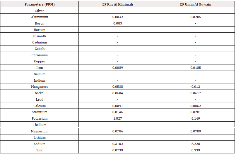 However, Na, Mg and Ca concentrations were found higher in Ras Al Khaimah (Table 1) than the UAQ. Among the studied metals Fe, Ca, Mg and Al concentrations were found higher in UAQ (Table 2).