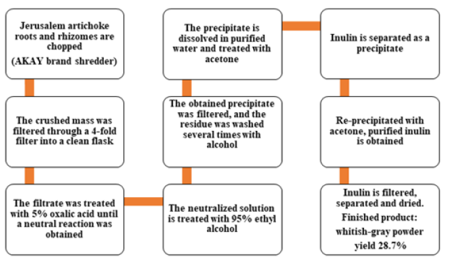 Technology of extracting inulin from roots and rhizomes. In November, the freshly collected roots and rhizomes are washed clean with water and dried after cleaning them from other impurities. After some round crushing, it was crushed in the AKAY brand shredder. The crushed mass was filtered through 4 layers of filtration into a clean container and the juice was separated. It is then alkalized with calcium oxide. The processed sediment is removed by filtering. The filtrate is treated with 5% oxalic acid until a neutral reaction is obtained. The neutralized solution is treated with 95% ethyl alcohol, the separated precipitate is filtered, and the residue remaining on the filter is washed several times with alcohol. The precipitate is placed in another clean container and dissolved in a small amount of purified water, then treated with acetone. At this time, inulin is separated in the form of a precipitate. Purified inulin (28.7%) is obtained by repeated precipitation with acetone. Inulin is a whitish-gray powder that is very soluble in water (Figure 3).