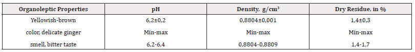 For this purpose, 50 g of plant raw materials were weighed on an electronic scale and transferred to a chemical beaker with a volume of 1000 ml. 175 ml of 30% ethyl alcohol was added to it. The volume of the solvent was calculated according to the formula V=V1+PK. V= V1+PK= 100+ 50 x1.5=175 ml. The extraction process was carried out for 7 minutes in the Stegler DG 360 model device in the High Speed Disperser with the presence of ultrasound (extraction time 5 minutes, temperature 35°C, frequency 50 Hz, power 360 W). The obtained extract was filtered, the plant residue was compressed. The compressed plant residue was placed in a clean chemical beaker, 100 ml of 30% ethyl alcohol was added to it, and the extraction process was carried out in the previous order. Extracts were combined. It was stored at 8°C for 3 days, filtered through a paper filter into a clean flask, evaporated until an aqueous extract was obtained in a vacuum-evaporator, and its physicochemical properties were determined (Table 1).