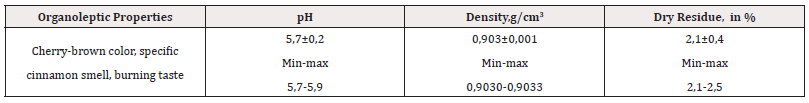 Aqueous extract-concentrate of cinnamon barks is prepared in a ratio of 1:2. For this purpose, 50 g of cinnamon sticks were weighed on an electronic scale, crushed in a mortar and transferred to a chemical beaker with a volume of 1000 ml. 175 ml of 30% ethyl alcohol was added to it. The extraction process was carried out as described above. The volume of the extractant was calculated as follows. V=V1+PK= 100+ 50 x1.5=175 ml. Further operations were continued as in ginger extract. Some physicochemical properties of the aqueous extract-concentrate obtained from cinnamon sticks are given in (Table 2).