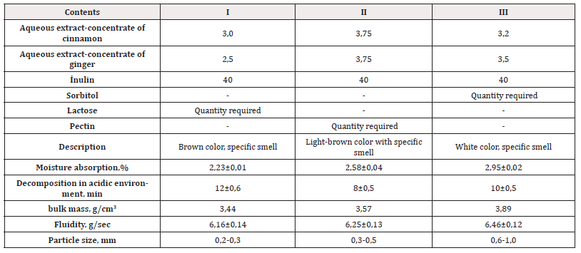 Results: Inulin with a whitish-gray color, well soluble in water and a yield of 28.7% was obtained from Jerusalem artichoke. A 1:2 aqueous extract concentrate was obtained from cinnamon bark and ginger roots with the presence of ultrasound in a Stegler DG 360 model device (extraction time 5 minutes, temperature 35°C, frequency 50 Hz, power 360 W). Physico-chemical properties of aqueous extract-concentrates were studied: organoleptic properties of cinnamon extract (smell-specific cinnamon smell, cherry red color), pH-5.7±2; density: 0.9030±0.001g/cm3, dry residue: 2.1±0.4; organoleptic properties of ginger extract (smell-specific ginger smell, yellow color), pH-6.2±0.2; density: 0.8804±0.001g/cm3, dry residue: 1.4±0.3. Some quality criteria of prepared phytogranules have been determined. Thus, phytogranules decompose in an acidic environment: 8±0.4 min, scattering mass: 3.57±0.01 g/cm3, fluidity - 6.250.13g/sec, 0.2 mm in size when analyzing the fractional composition granule particles were 50.43%.