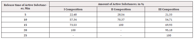 The study of biological absorption of drugs is one of the important stages of research, which allows to substantiate the pharmacotherapeutic effect of the selected composition. The study of biological assimilation of phytogranules was carried out in vitro experiments ("Rotating basket") according to the "Dissolution test" method. Here, the pH of the environment, the speed of rotation of the basket, etc. affect the separation of the medicinal substance from the granule. such factors influence. We comparatively studied the release rate of the medicinal substance from the granule in the 3 ingredients we prepared. Studies have been continued in the direction of developing the optimal conditions of the "dissolving" test. For this purpose, water, artificial gastric medium (pH-1.2: water-1000 ml, hydrochloric acid-3 ml, pepsin-1.5 g) was used. The research work was carried out in a "rotating basket" device with 5 g of phytogranules, 200 volume/min rotation speed, and 1000 ml of solvent volume. 5, 10, 15, 20, 25 minutes after the device was started, samples (25 ml) were taken from the solutions passing biologically active substances and fresh solutions were added to the dialysate. Thus, according to this procedure, a sample of the dialysate was taken and the amount of biologically active substances released from the granules and transferred to the dialysate was determined. The determinations were repeated 5 times. Each of the samples taken for this is concentrated in a porcelain bowl until a dry residue is obtained and its weight is determined. Experiments were performed separately for each composition. The obtained results are given in (Table 4).