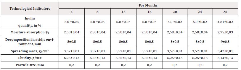 Preparation of biologically active food supplement - granules based on purified inulin was carried out by wet granulation method. For this purpose, 40 g of inulin is mixed with 53.5 g of pectin in the mortar. The mixture is moistened with the aqueous extract-concentrate of cinnamon barks and ginger rhizomes, which we prepared in advance in a ratio of 1:2 (taking 3.75 ml of each). That mass is granulated by passing through the granulation machine. The received granules are dried at a temperature of 45-50°C. Some technological properties of phytogranules have been comparatively studied. The obtained results are shown in (Table 3).