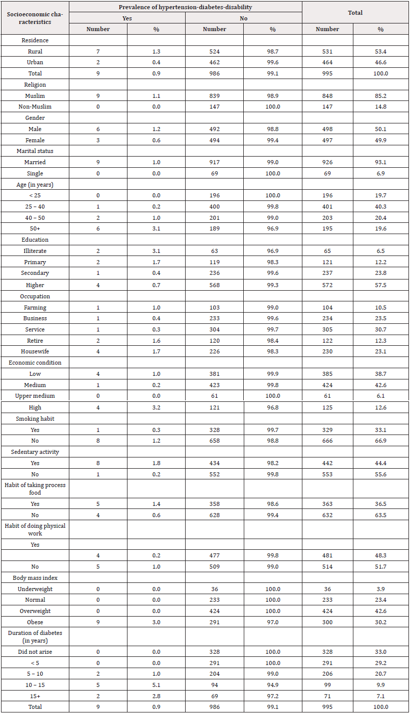 The responses of 995 adults of both urban and rural areas were analysed to fulfil the objective of the study. The respondents were males and females in the ratio 50.1: 49.9. Among male respondents 1.2% were patients of hypertension-diabetes-disability against 0.9% affected sample adults under consideration. These males had 100.0% more risk of affecting simultaneously from the above mentioned 3 diseases compared to the risk of females [ R.R.=2.00; C.I. (0.43, 7.95)], though rate of female patients (0.6) was not significantly different from the rate of affected male patients [ = 1.003, p-value=0.317]. The sample rural people were 53.4%; 1.3% of them were suffering from the above mentioned 3 non-communicable diseases. The corresponding percentage among urban people was only o.4%, this differentials in prevalence was not significant [ =2.175, p-value=0.140]. The risk of prevalence in rural people was more than three times compared to the risk of urban people [ R.R.=3.06, C.I. (0.64, 14.65)]. All 9 affected adults were Muslims; non-Muslim adults were 14.2% in the sample, none of them was patient of hypertension-diabetes-disability. Similar was the case in prevalence rate in single adults, where only 6.9% people were single adults. The sample elderly people were 19.6% (age 50 years and above); the prevalence rate in them was 3.1%. This rate was significantly higher than it was in other adults [ = 13.991, p-value=0.000.]. The risk of prevalence in them was 8.21 times [R.R.=8.21, C.I. (2.07, 32.56)]. The prevalence rates in adults of different levels of education were statistically similar [ =5.063, p-value= 0.167]. However, among 6.5% illiterate people in the sample the prevalence rate of the disease was 3.1% and for them the risk of prevalence was 4.09 times compared to the risk of other adults [ R.R.= 4.09, C.I. (0.87, 19.87)]. The prevalence rates of the disease among adults of different levels of education were statistically similar though highest rate (1.7%) was noted in housewives and they had 166% more risk of prevalence [=4.252, p-value=0.373; R.R.=2.66, C.I. (0.72,9.83)]. There were 12.6% sample adults who belonged to families of higher economic conditions. The prevalence rate in them was 3.2% and this rate was significantly higher than the rates prevailed in adults of families of other economic conditions [ = 10.098, p-value= 0.018]. The risk of prevalence for this group of adults was 5.57 times compared to the risk of other adults [ R.R.= 5.57, C.I. (1.52,20.47)]. The sample smoker adults were 33.1% and prevalence rate in them was 0.3% which was lower than that in non-smokers (1.2%). But this differential was not statistically lower [ = 1.978, p-value=0.160], though non-smokers had around four times risk of prevalence [ R.R.=3.95, C.I. (0.49, 31.54)]. The percentage of adults involved in sedentary activities was 44.4; prevalence rate in them was 1.8%. For them the risk of prevalence was 10.01 times compared to the risk of others [ R.R.=10.01, C.I. (1.25, 79.93)]. Prevalence was significantly associated with involvement in sedentary activity [ =7.274, p-value=0.007]. Process food consumers had 118% more risk of prevalence [ R.R.=2.18, C.I. (0.59, 8.08)], though the rates for consumers (1.4%) and non-consumers (0.6%) were statistically similar [ =1.426, p-value=0.230]. The percentage of process food consumers was 36.5. Percentage of physically inactive adults were 51.7 and 1.0% of them were patients of hypertension including diabetes disability. The percentage of physically active adults were 48.3; the prevalence rate in them was 0.2%. These two prevalence rates were statistically similar [ = 0.055, p-value=0.814]. The risks of prevalence for both the groups were almost similar [ R.R.=1.17, C.I. (0.32, 2.48)].