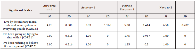 As seen in Table 1, participants with Navy spouses reported the highest endorsements of living by the military moral code and value system in everything they do (GANZ 5), followed by Marine Corps spouses, Army spouses, and Air Force spouses respectively. Table 1 also reflects that the highest scores on this military cultural value were obtained not only by those with Navy spouses, but next highest were those with Marine spouses-whereas this value was less endorsed by those whose spouses were ground (army) or air services (air force). Additionally, participants with Navy and Army spouses endorsed the lowest engagement of avoidant coping style of giving up trying to deal with it (COPE 6) and refusing to believe it happened (COPE 8). Whereas participants with Marine Corps spouses reported slightly higher frequency of use and Air Force spouses reporting the highest use of avoidant coping skills.