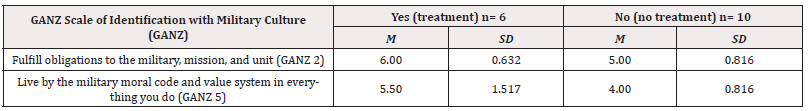 Table 10: Means and Standard Deviation of the effect of Participant Mental Health Treatment and Military Culture Identification.