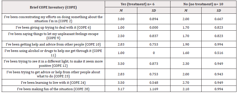 Table 12: Means and Standard Deviation of the effect of Participant Mental Health Treatment and Coping Strategy.