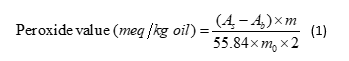 Peroxide Value (PV) is measured as an indicator of oxidation for the oil containing samples. IDF standard method was used to measure the peroxide value of peanut oil and peanut oil encapsulates [5]. A sample of 1g was extracted in 10mL distilled water. A 400μL of extract was mixed with 1.5mL of iso-octane: isopropanol (2:1) and vortexed. After the phase separation, the supernatant was taken to measure PV. A 400μL of extract was added to 9.6mL of a chloroform-methanol (7:3) solvent. Colour was developed with freshly prepared 50μL of ammonium thiocyanate and iron (II) chloride solution. The samples were briefly vortexed and allowed to react in the dark for 30mins. Standard was prepared with using iron (III) chloride (Fe+3). The absorbance was made at 500nm, and peroxide value was calculated by the following equation,