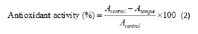 The DPPH (α, α-diphenyl-β-picrylhydrazyl) radical scavenging activity was measured as suggested by Luo, et al., [7]. Extraction was carried out using alcohol at 1:10 ratio. The total volume of 2mL was made. DPPH solution (0.012g/100mL alcohol) was added to the samples and shaken vigorously. The process was carried out in completely dark environment. Samples were allowed to react for 30 minutes. Absorbance was measured at 517nm, and the antioxidant activity was calculated by equation,