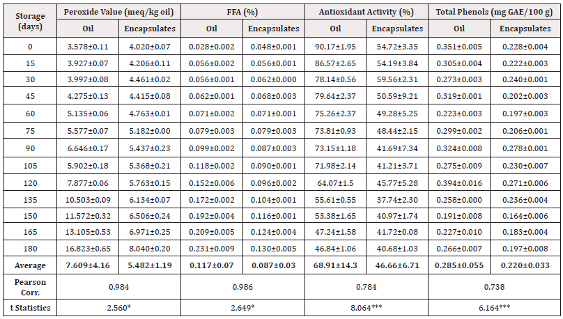 Table 2: Bio-chemical characteristics of unencapsulated and encapsulated peanut oil during storage.