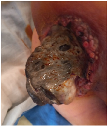 A 55-year-old woman presented with one year history of the presence of a painless mass on the anal region, on which diagnosis of GCT perianal is confirmed, patient has a surgical excision without radiotherapy or chemotherapy adjuvant. 4 years later, this patient arrived at a hospital with a painless mass on the anal region (Figure 1), the thoraco-abdominal and pelvic CT scan showing the presence of a right anal and para-anal mass measuring 130*81mm extended to the surrounding soft tissues and infiltrating the neighboring muscular structures on the right side and the perineal and buttock skin (Figure 2) with pulmonary metastasis.