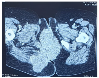 Figure 2: CT scan showing the presence of a right anal and para-anal mass measuring 130*81mm extended to the surrounding soft tissues and infiltrating the neighbouring muscular structures on the right side and the perineal and buttock skin.