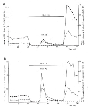 Figure 1: Influence of Folliculo-Stellate (FS) cells (open circles) on angiotensin II (A II) stimulated prolactin (PRL) secretion under dopamine (DA) inhibition and rebound effect (on PRL secretion in enriched populations of lactotroph cells (closed circles) (© Allaerts, 1989; adopted from [18]).