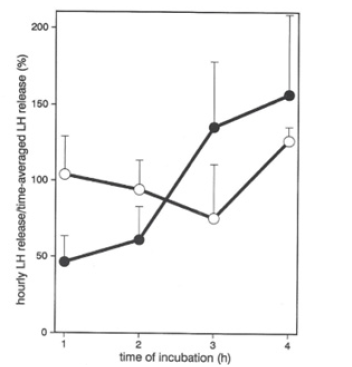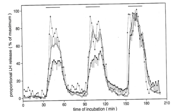 Figure 3: Effect of FS-cells on biphasic LH secretion in gonadotroph enriched cells responding to repetitive GnRH stimulation (in the presence [circles] or absence [closed triangles] of ovarian peptide feedback) (© Allaerts, et al., 1994; adopted from [21]).