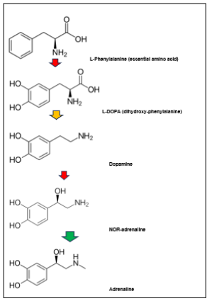 Figure 4: Biosynthesis of catecholamines derived from the essential amino acid L-phenylalanine (top). Enzymatic transformation steps include 2 hydroxylases, (red arrows), one of which is known as dbh (see main text), a decarboxylase (yellow arrow) and methyltransferase (green arrow) (Chemical structures from Wikipedia Chemistry).