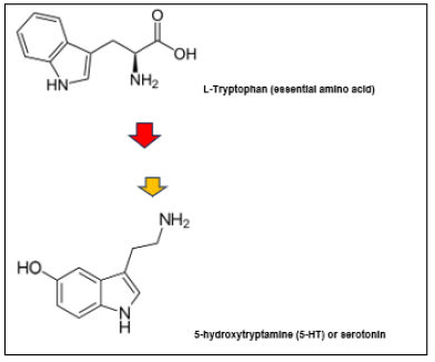 Figure 5: Biosynthesis of serotonin from the essential amino acid L- tryptophan (top). Enzymatic transformation steps include a hydroxylase (red arrow) and a decarboxylase (yellow arrow) (Chemical structures from Wikipedia Chemistry).