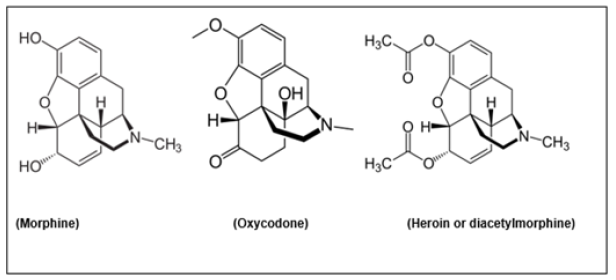 Figure 7: Chemical structures of three heavy painkillers: morphine (left) and closely related derivatives, oxycodone (middle) formed by (among others) a methyltransferase step, and heroin (right), formed by a twofold acetylation of morphine (Chemical structures from Wikipedia Chemistry).