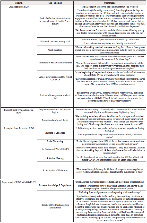 From the result obtained from the interview, it can be stated that the four themes identified in this case include challenges faced by HCW during COVID-19, Impact of COVID-19 pandemic on HCW, strategies that can help in protecting HCW and experiences they went in work during this period. The major challenges that have been identified to have an impact on HCW at the time of pandemic include lack of communication between leaders and health practitioners, it was one of the challenges that many health practitioners complained about it. The outbreak of the virus among staffs while treating patients 5 from 10 participants was infected with corona virus, and one of them lost his father due to infection. also, it was leads to a shortage in health practitioners and an increase in workload. The shortage of PPE due to the high consumption at the beginning of the pandemic and the delay in supply systems, many hospitals in the Asir region faced shortages in some personal protection tools such as the mask, deficiency in size of N95 and gowns despite the support provided by the Ministry of Health. lack of awareness about its risks and lack of efficiency in some medical staffs due to increase the intensive care beds 100% in all hospitals in the Asir region and they were supported by nurses who work in different departments in the hospital or from primary healthcare centers and they don't have experience work in ICU or dealing with critical cases.