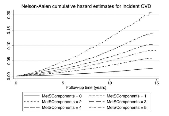 Figure 1: Cumulative hazard estimates for groups with different number of metabolic syndrome criteria (components) regarding the composite CVD endpoint during the follow-up period. P<0.0001 for overall difference between groups.