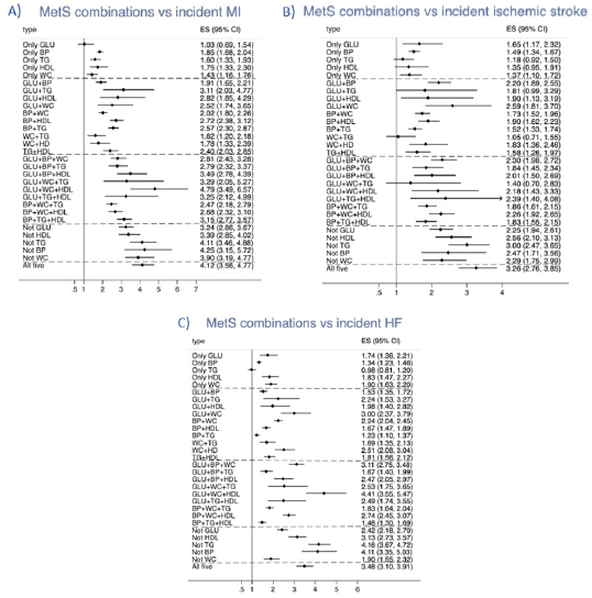 Figure 2: Relationships between different combinations of the five metabolic syndrome (MetS) criteria and (A) incident myocardial infarction, (B) ischemic stroke, and (C) heart failure. The estimate (ES) is the hazard ratio for comparison vs the group of individuals without any MetS component. GLU=glucose criteria, BP=blood pressure criteria, TG=triglyceride criteria, HDL= HDL-cholesterol criteria, WC= waist circumference criteria. The dashed lines denote the divisions between 1, 2, 3, 4, and 5 criteria.
