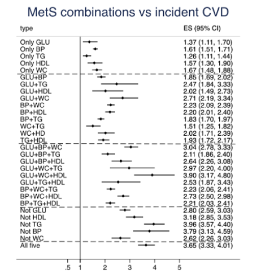 Figure 3: Relationships between different combinations of the five metabolic syndrome (MetS) criteria and incident cardiovascular disease (CVD) (combined endpoint): The estimate (ES) is the hazard ratio for comparison vs the group of individuals without any MetS component. GLU=glucose criteria, BP=blood pressure criteria, TG=triglyceride criteria, HDL= HDL-cholesterol criteria, WC= waist circumference criteria. The dashed lines denote the division between 1, 2, 3, 4, and 5 criteria.