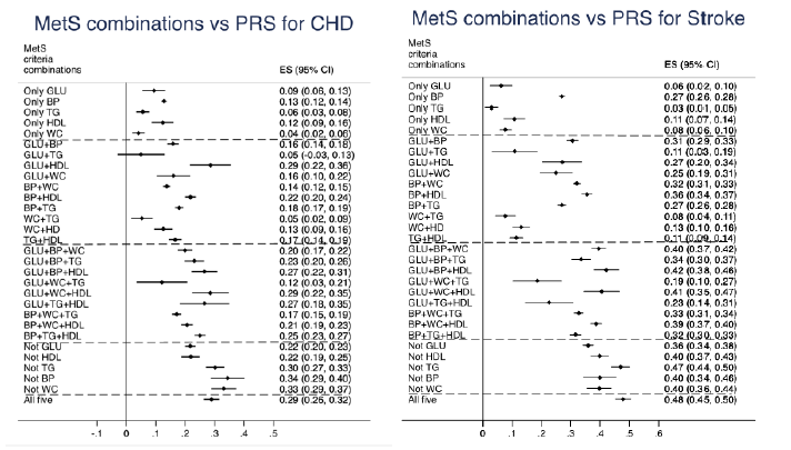 When the different groups with MetS combinations were related to the PRSs for CHD and ischemic stroke, linear regression models were used with the same confounders as used above when evaluating incident outcomes.